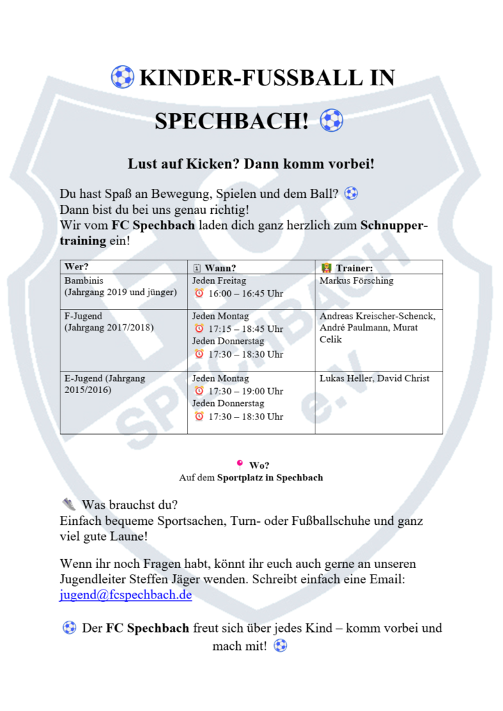 Duschsanierung26. Juni 2025Einladung zum Festbankett anlässlich des 80-jährigen Vereinsjubiläums31. Oktober 2025 Veröffentlicht durch katy.kraus am 20. Oktober 2025 Kategorien Allgemein Jugend Schlagwörter Teilen Verwandte Beiträge31. Oktober 2025Einladung zum Festbankett anlässlich des 80-jährigen VereinsjubiläumsMehr Anzeigen26. Juni 2025Wichtige Mitteilung an alle SportplatzbesucherMehr Anzeigen22. Mai 2025Scheine für VereineMehr Anzeigen